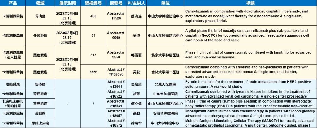 此外,在头颈肿瘤、黑色素瘤、骨肉瘤、鼻咽癌、肾细胞癌、尿路上皮癌等多个领域,卡瑞利珠单抗、吡咯替尼等产品相关研究一共入选了4项壁报展示和5项线上发表,彰显了918博天娱乐强大的自主研发综合实力。